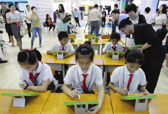 在演示上課的過程中,“老師”手執(zhí)平板電腦,“學生”的課桌上也每人有一臺平板電腦。“老師”播放的拔河比賽動畫,“學生”在自己的平板電腦上可以同步看到,并在電腦上完成習題。電腦系統(tǒng)后臺可以實現對每位學生所做客觀題的對錯進行判分,并反饋到“老師”手中的電腦上,老師據此掌握到了每個學生課堂學習情況,并可以進行重點教學和分層次教育。