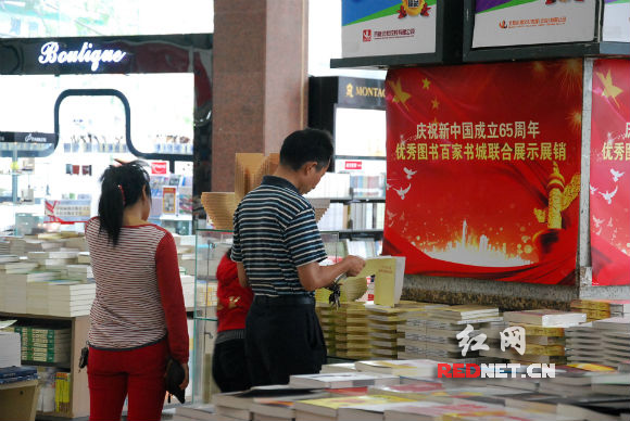 在湖南圖書城、邵陽湘中圖書城,門口懸掛著“慶祝新中國成立65周年優秀圖書百家書城聯合展示展銷活動”的橫幅,進門最顯眼處就是集中展示《之江新語》、《改革熱點面對面》、《鄧小平》等上百種優秀圖書的專區。兩家書城都在國慶期間延長營業時間,并對讀者購書提供優惠活動。